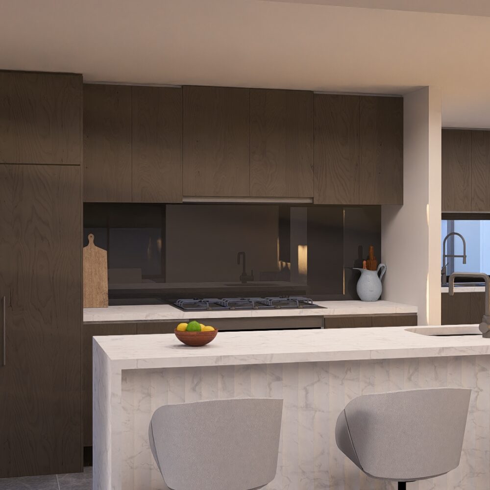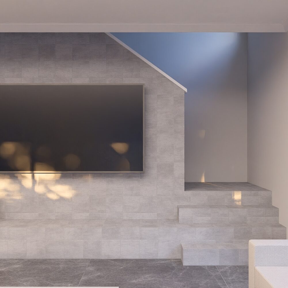 The living room beautifully frames the stairs, with a beautiful TV mount framed by a feature plinth. Ample windows fill the living area with natural light, creating a beautiful space to relax and spend time in as a family.