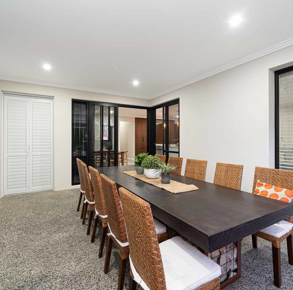 The home’s cool, grey theatre room is perfect for enjoying a movie with the family. Raised seating gives the cinema experience at home, and plenty of space for beanbags for the perfect sleepover experience. Complete with built-in surround sound and a projector screen, the theatre is a great place to enjoy the latest Hollywood blockbuster.